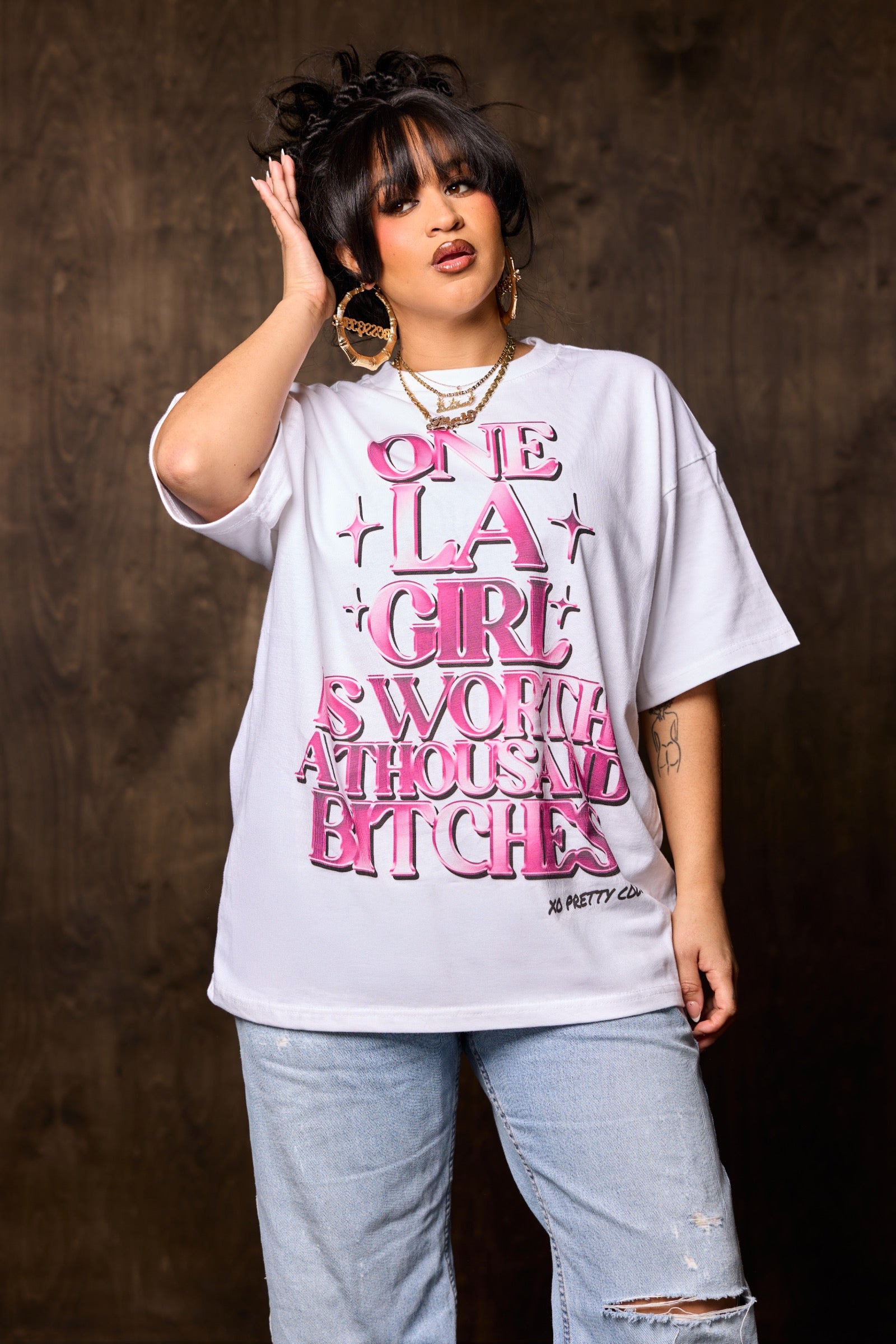 One LA girl is worth a thousand bitches hot pink and black print tee with XO Pretty Cozy signature at bottom. Fits one size up.